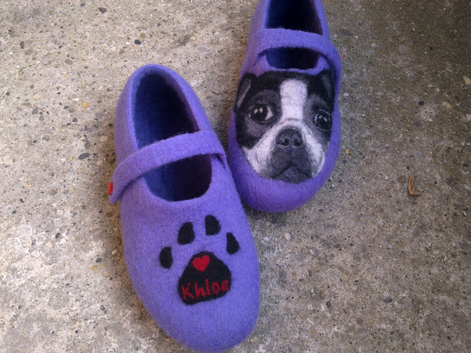 Original handmade slippers with portrait of your dog make with love and care for you and your family. Custom Dog portrait Boston Terrier. Please, send me a picture of your pet and I’ll put it on the slippers.