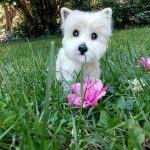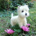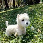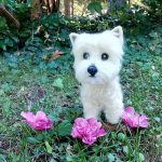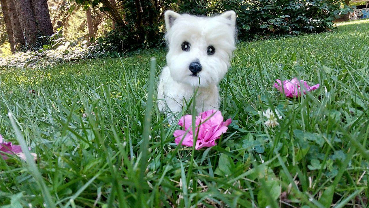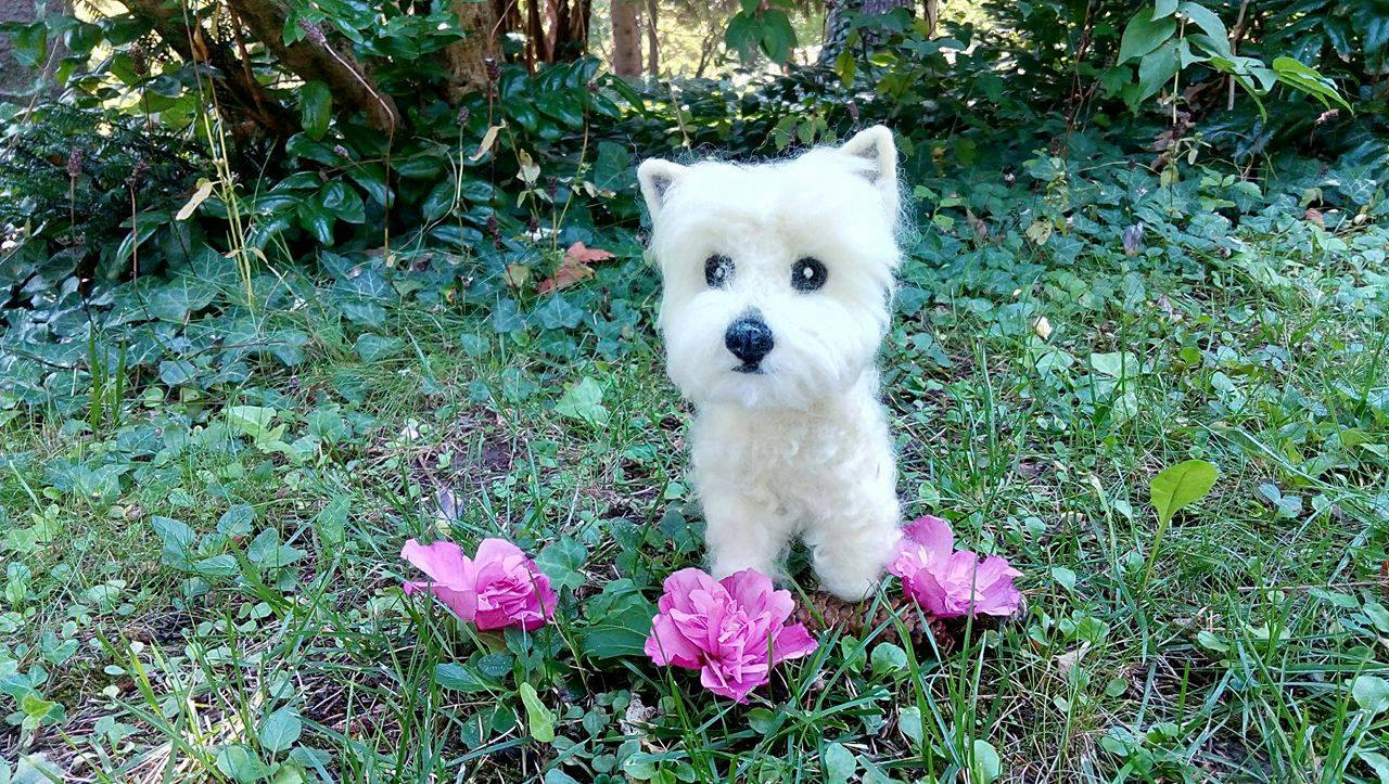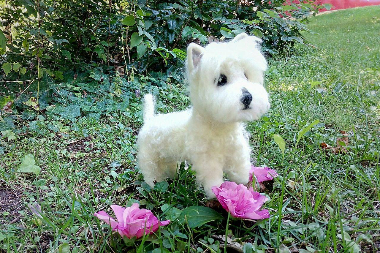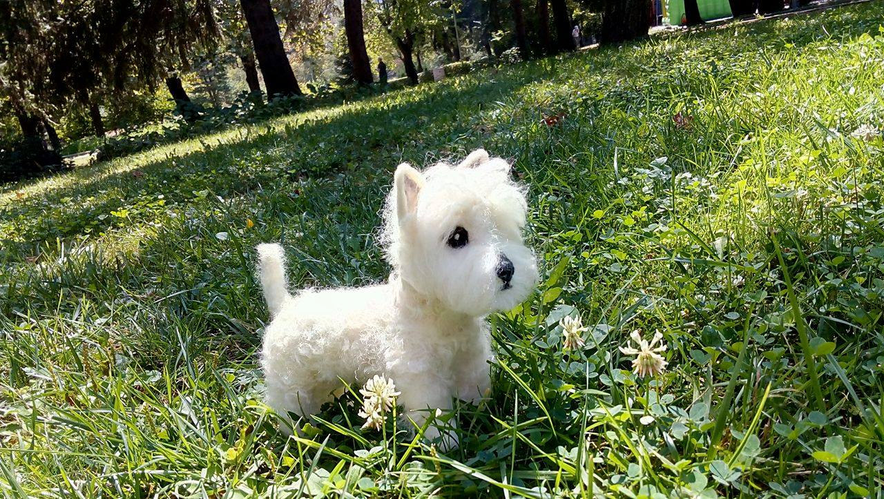 Size is 26 cm from nose to tail, height – 18 cm. Made of soft merino wool, wire and sheep’s locks.