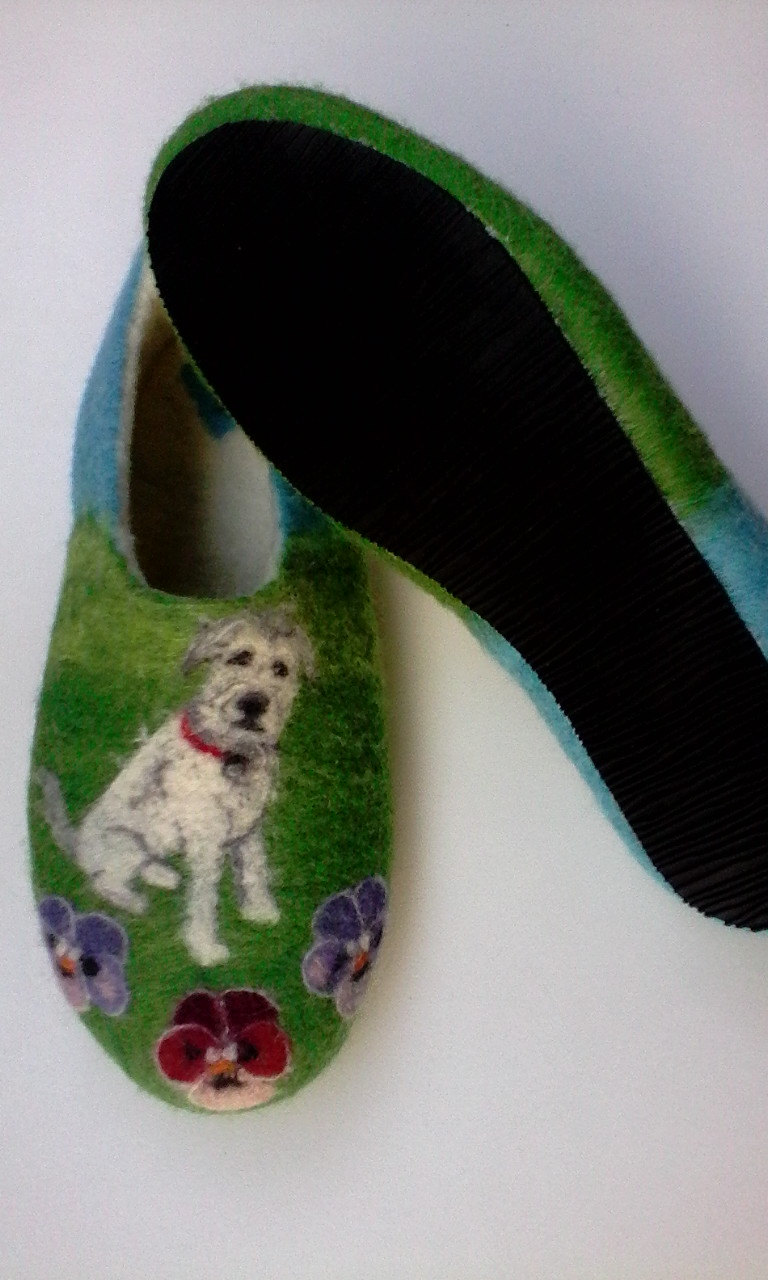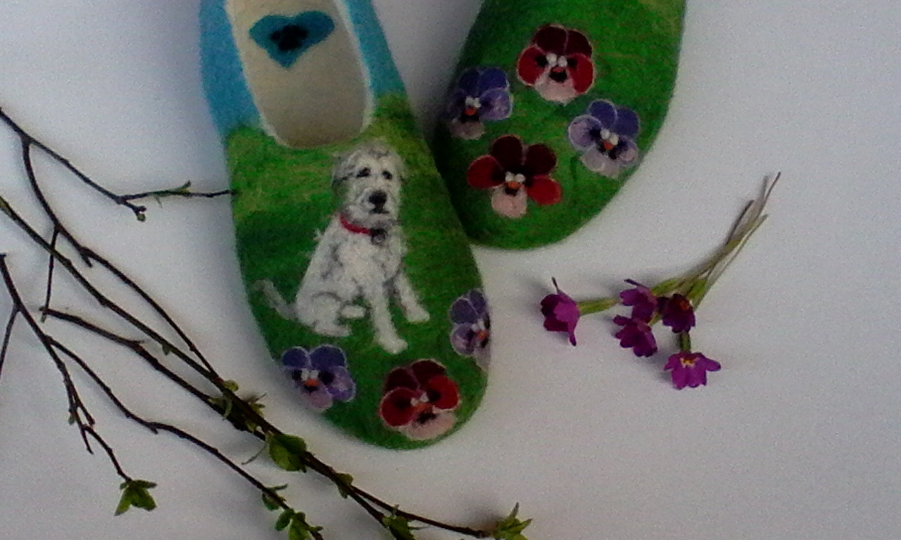 Send me a picture of your dog and a relevant shoes size and I’ll wool painted on the slippers.