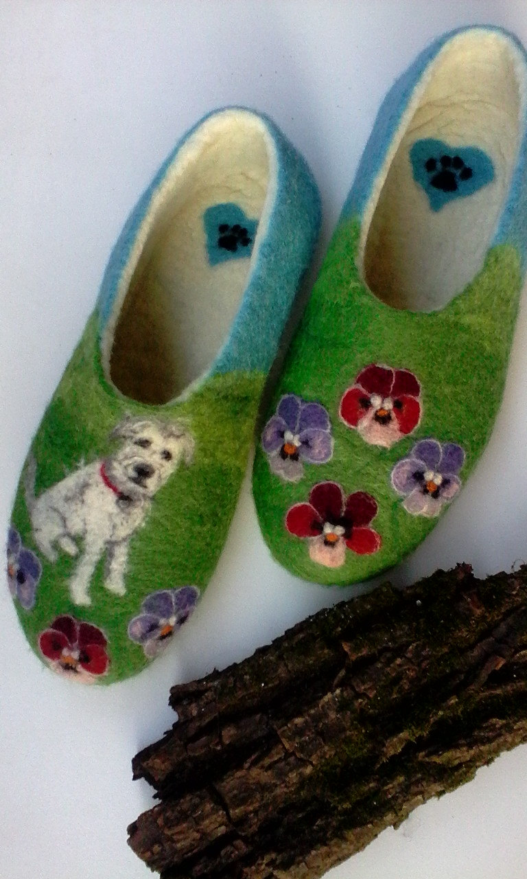 Handmade original felted slippers with portrait of your dog. Very suitable for an unique and unforgettable gift.