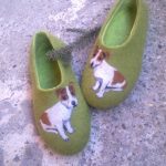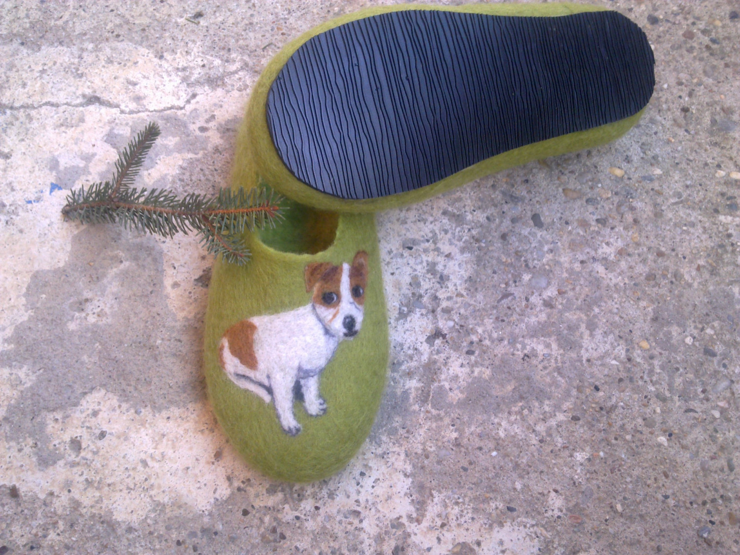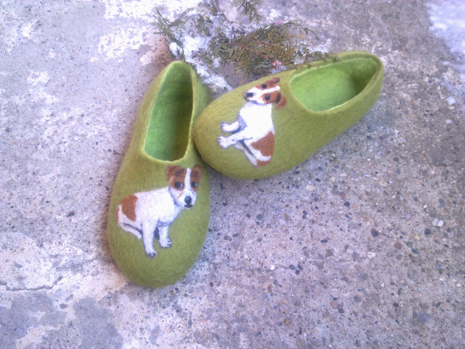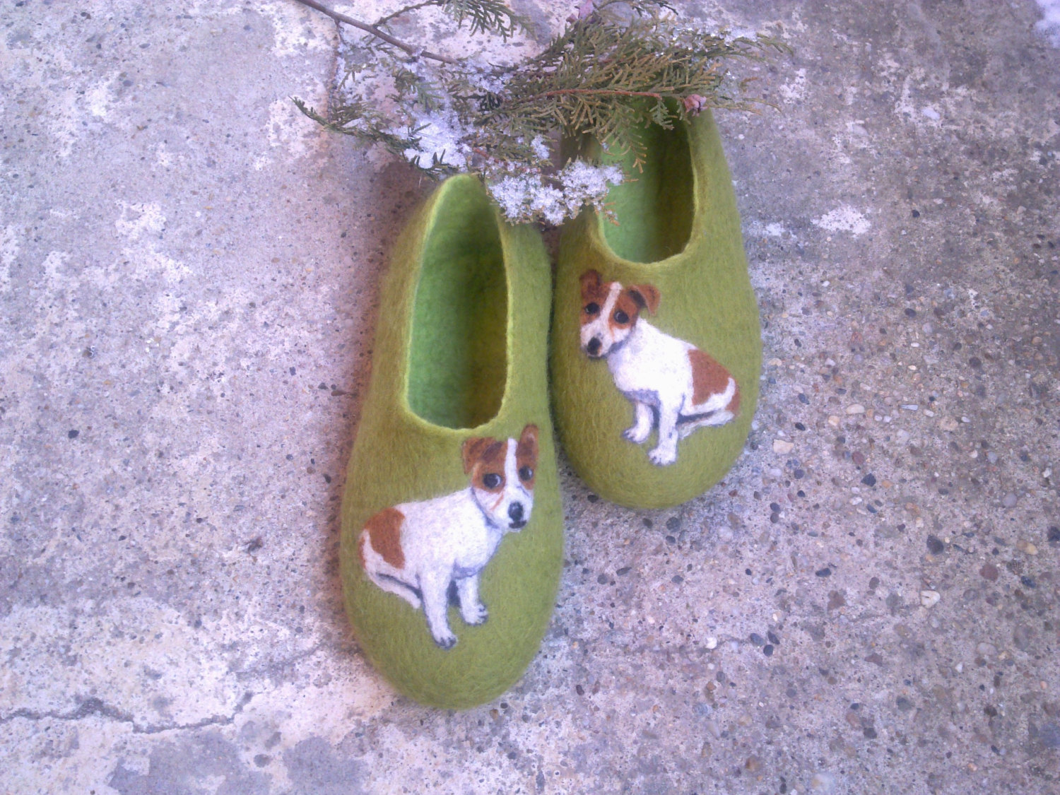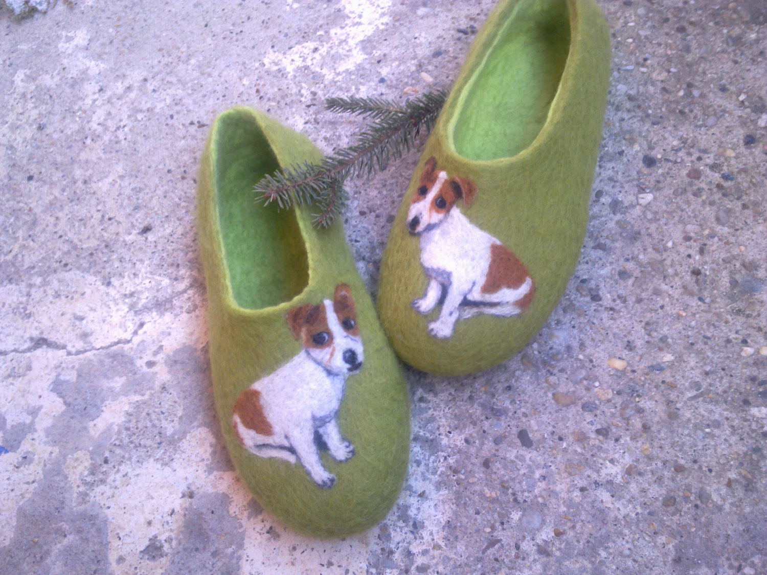Comfortable handmade felted slippers with your favorite Dog’s portrait baby Jack Russel Terrier. Perfect gift for your friends. Custom made order. Can made any dog or cat from photo.