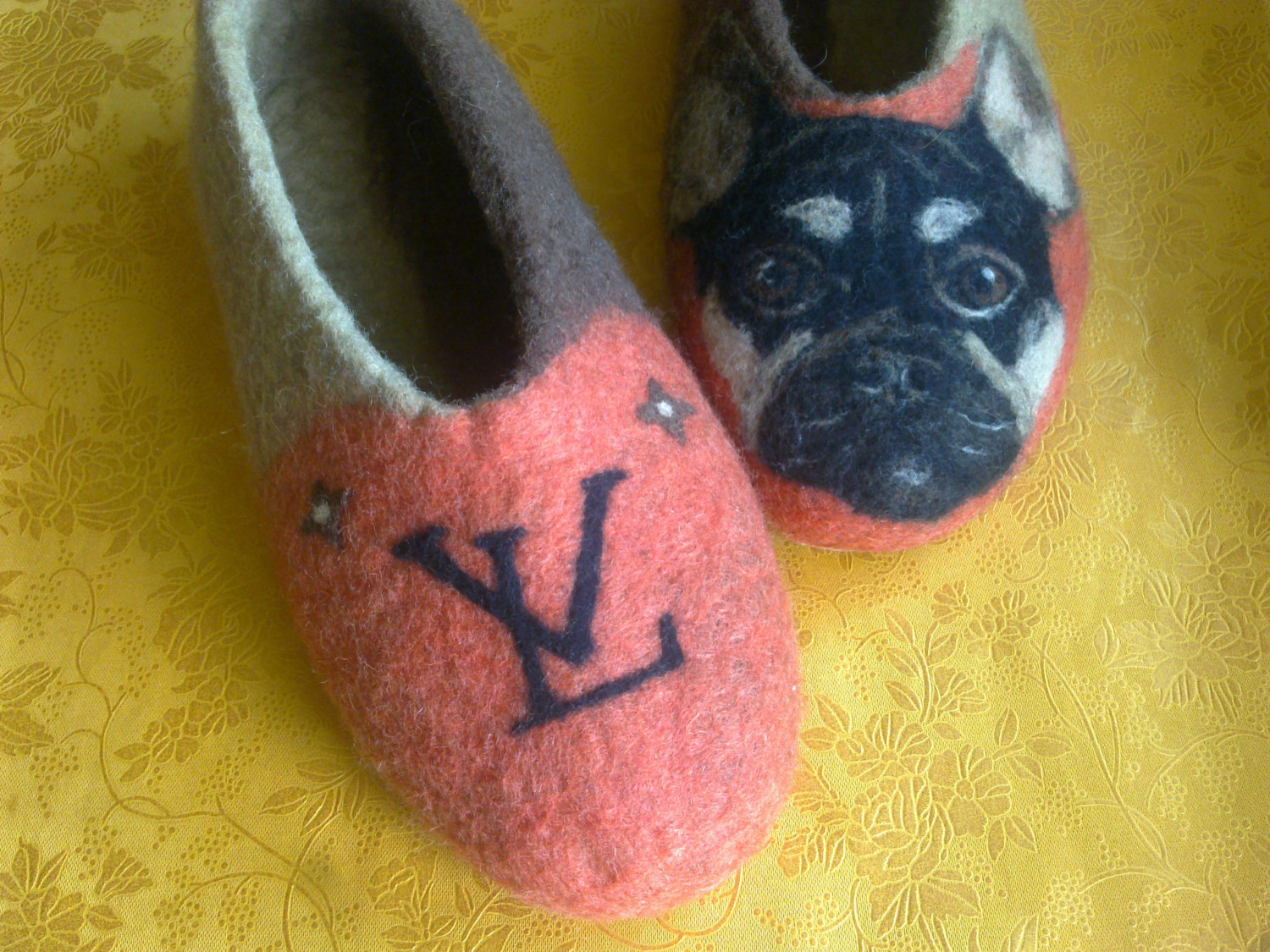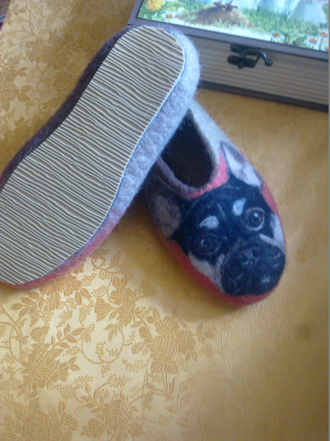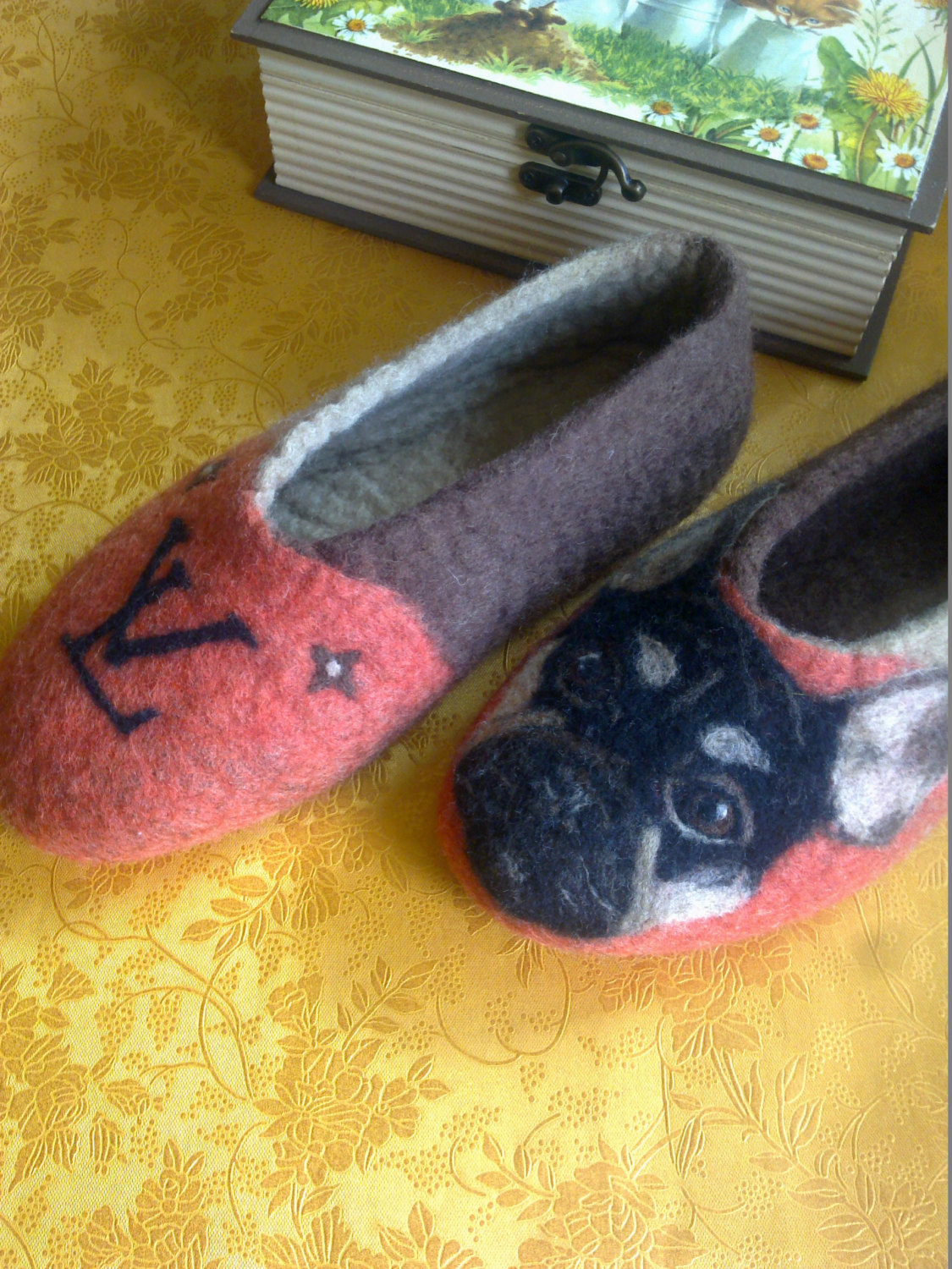 Please, send me a picture of your lovely dog and I’ll put it on the slippers.