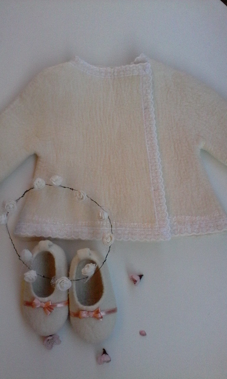 This unique baby coat is from 100% pure Australian very fine merino wool makes it supremely soft, light and ultra warm. It has a hidden button closure.The coat has tender decoration with white lace and fibers.
