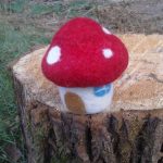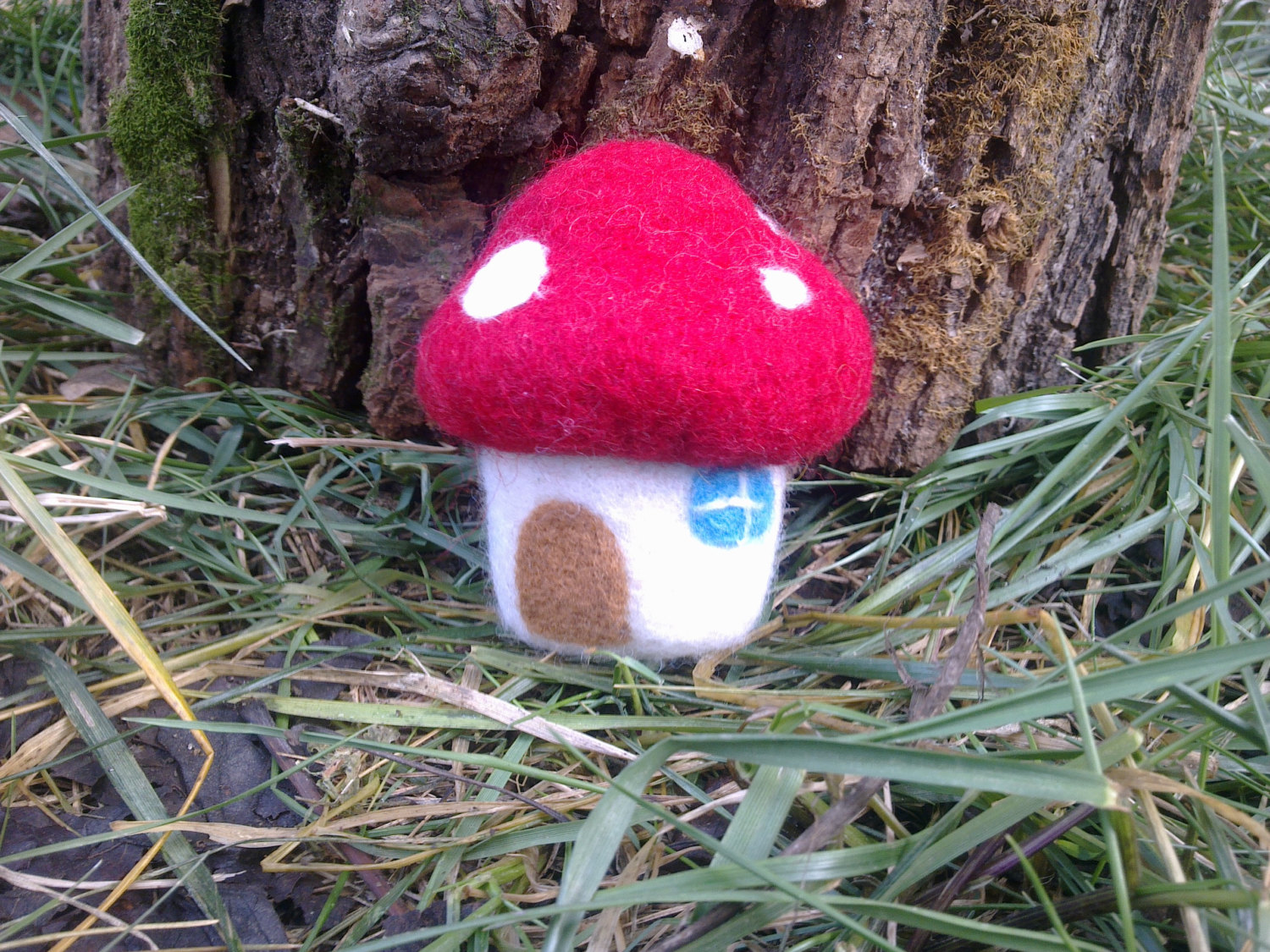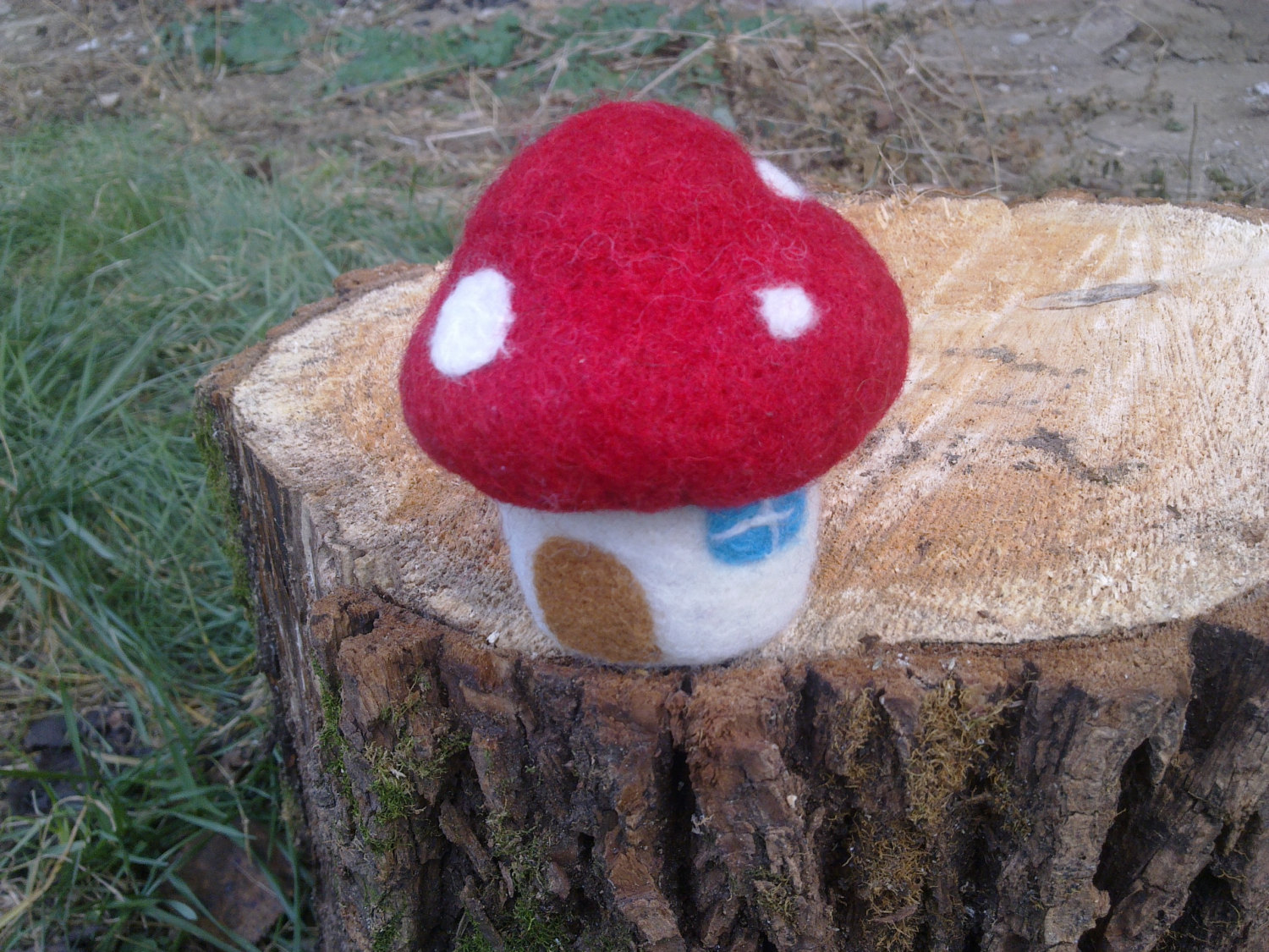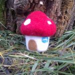 This charming mushroom house is 100% wool and handmade, using the needle felting technique. She looks great standing up or laying down and could go on your desk, mantelpiece or shelf.