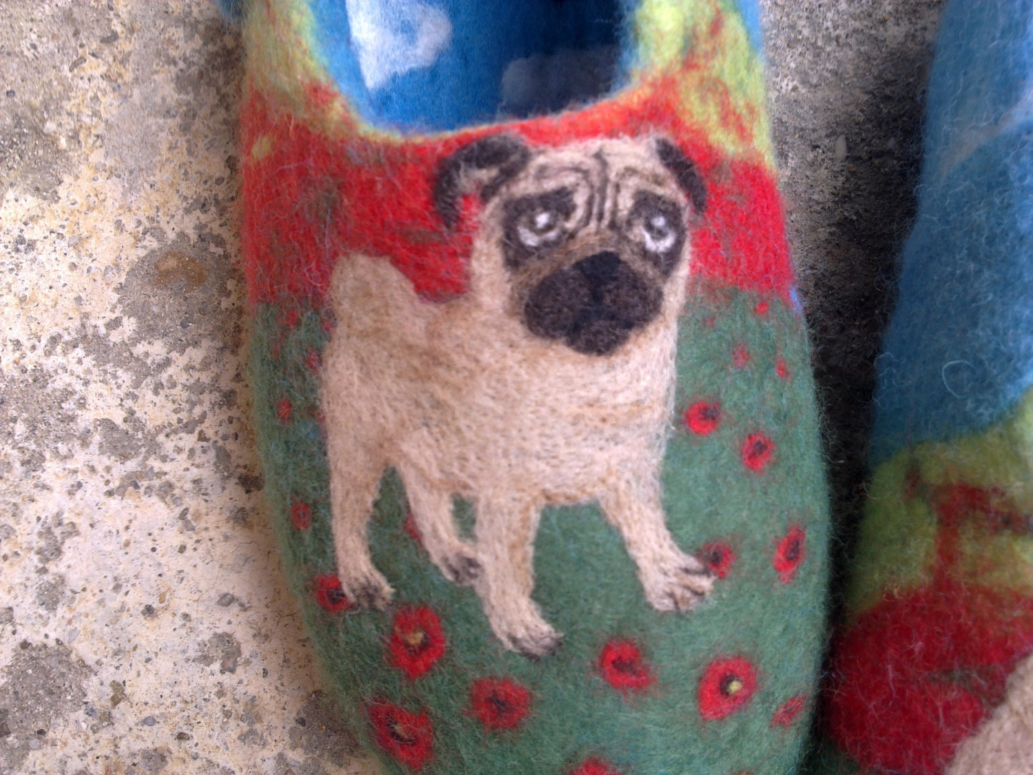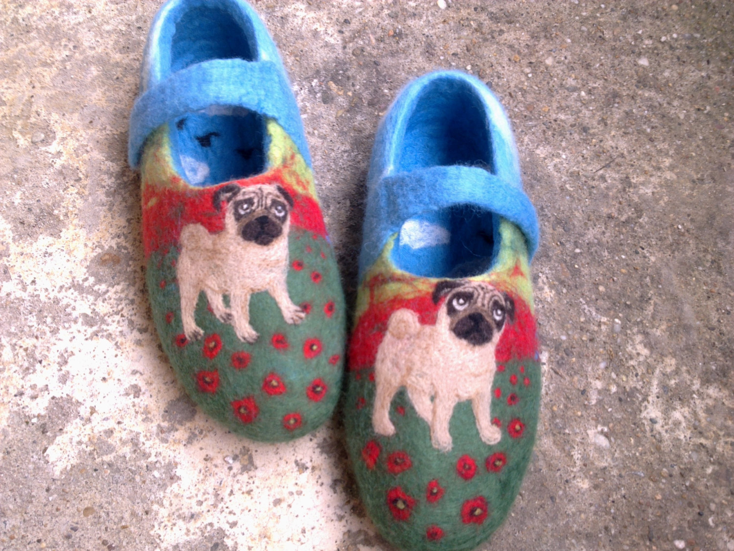 Wool painted Custom Dog portrait Pug. Send me a picture of your dog and a relevant shoes size and I’ll put it on the slippers.