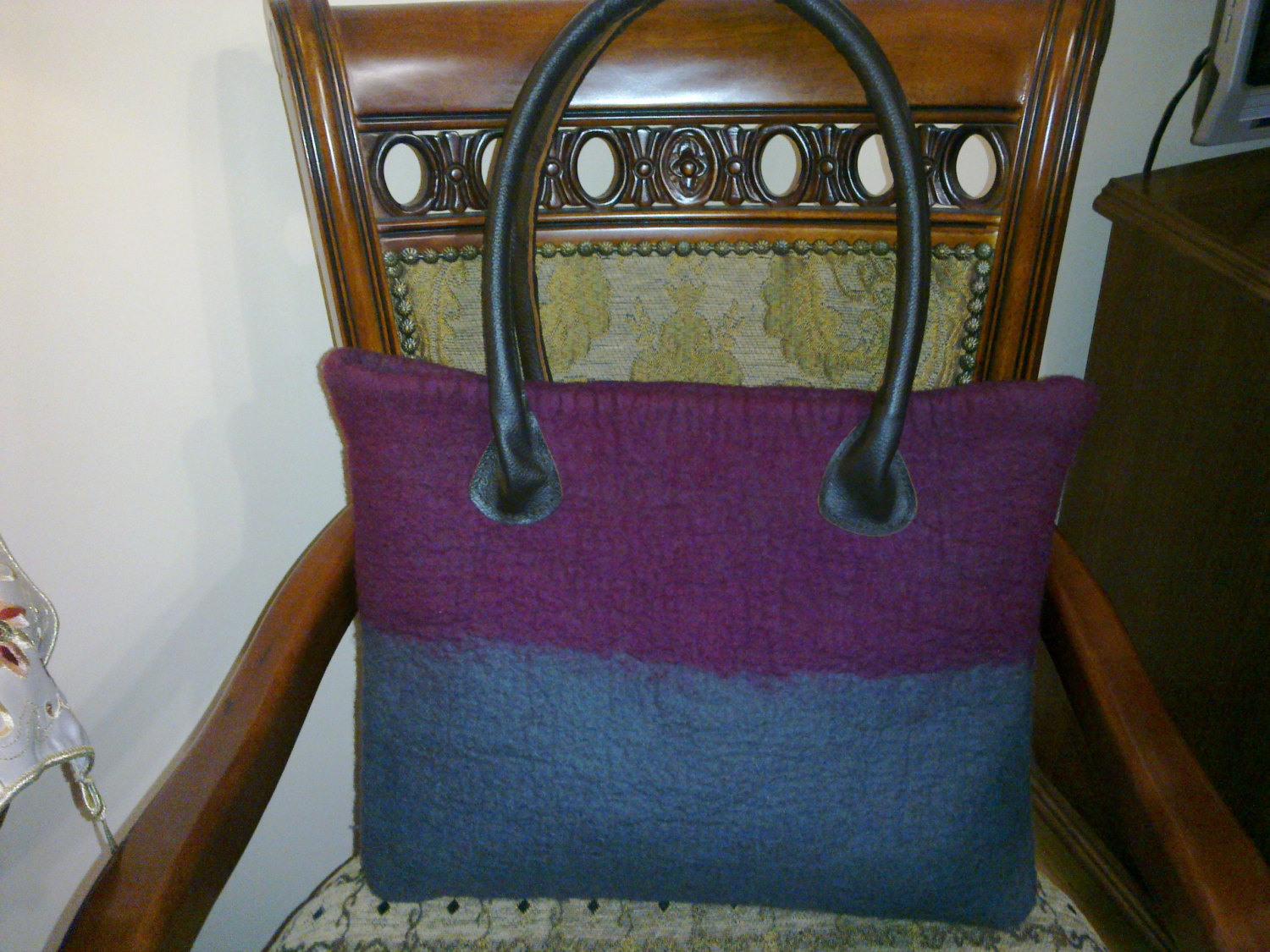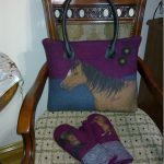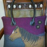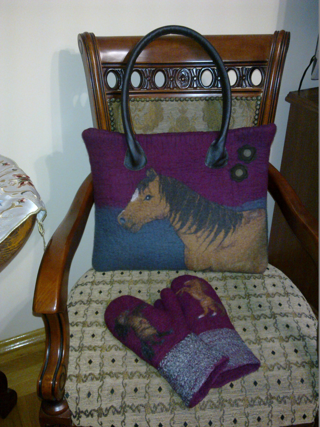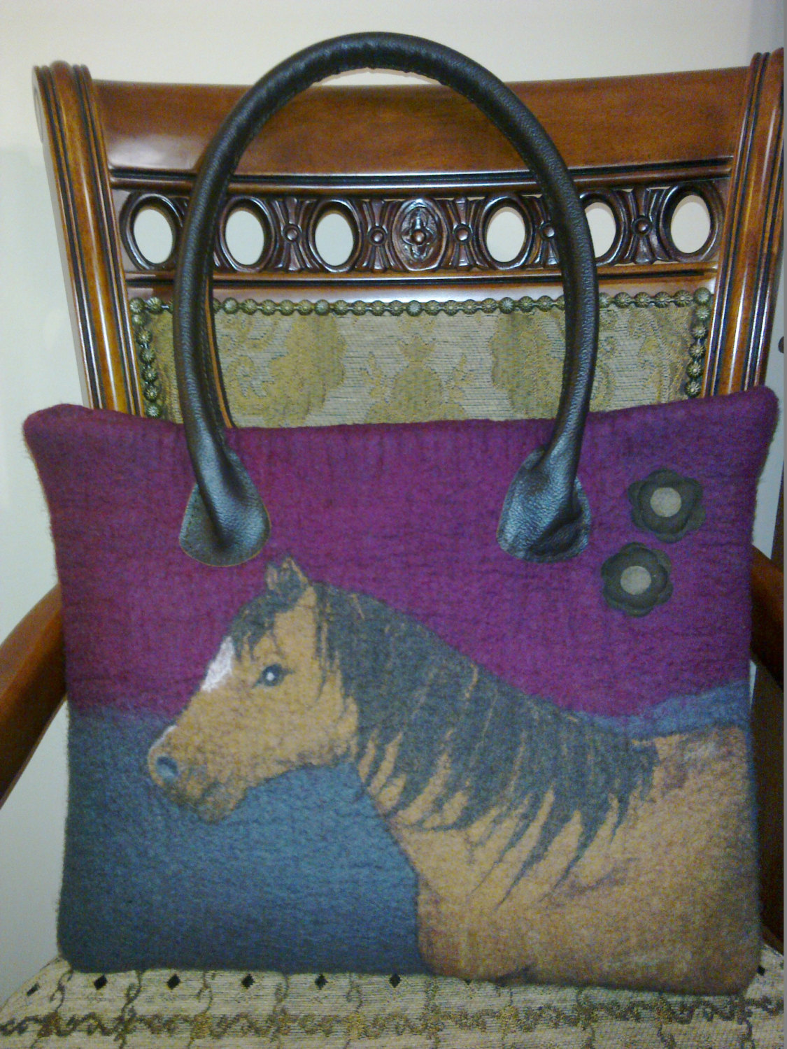 The bag is decorated with leather flowers and wool drawing brown horse. Has real leather handles, lining with three pockets. Fastened with two magnets.